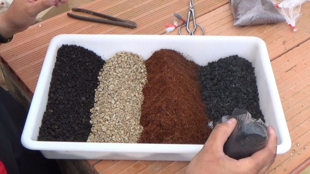 la tierras pueden llevar diferentes tipos de componentes como Akadama, turbas rubia o negra a mi me gusta mas la turba rubia , tierras volcánicas y algún componente mineral como Arlita o el kiryu, no es mi propósito el enseñar como se hace , hoy en dia se puede comprar en centros de Bonsai Como Bonsai Colmenar y otros , solo recordar que una buena composición es fundamental para la salud de nuestros bonsais, y os animo a que hagas vuestra mezcla con lo que yo pongo o lo que os parezca mejor , recordar que estas con un ser vivo y la tierra hara que el cultivo sea bueno , el riego sea correcto y muy importante la tierra drene bien y si lo haces con las akadamas quitarla el polvo con un cedazo y tambien mezclarlo con componentes drenantes, hoy en dia tambien en Japón están usando otras tierras en las que no añaden akadamas.