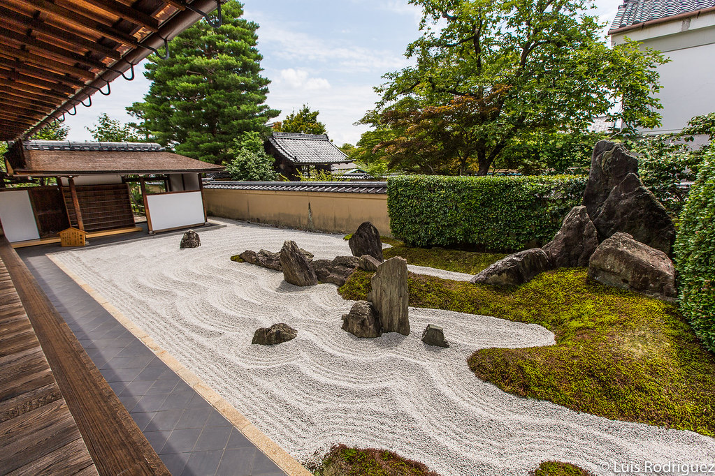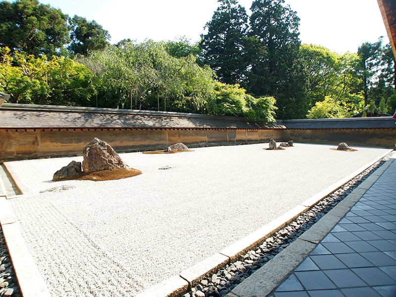 En Kioto, por otra parte, se encuentra el jardín seco o karesansui más conocido en el templo zen de Ryōanji. Este tipo de jardines no utilizan agua y la naturaleza se suele expresar con arena o en algunos casos piedras blancas y rocas. Se dice que de las 15 rocas que hay en el jardín seco de Ryōanji, sólo 14 pueden ser vistas sea cual sea el ángulo desde el que observemos el lugar.